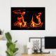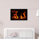 This poster depicts the abstract energy of fire in a wood burning stove. The orange, gold and yellow flames appear as joyful dancing characters. They are set off by a black background.