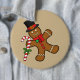 An illustration of a happy dancing gingerbread man with a top hat and a candy cane. During Christmas celebrations, gingerbread and candy cane are always present. Baking a gingerbread is a way for bonding with the family and making children happy.