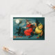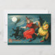 A beautiful vintage Halloween invitation featuring a witch dancing with a cat and a pumpkin character under the moon.