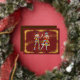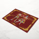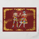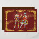 Two debonair harlequin dancers gracefully perform in vibrant costumes against a regal cranberry-red backdrop, adorned with decorative golden garlands and surrounded by delicate musical notes. Original illustration by artist, Noël Snow.