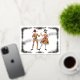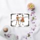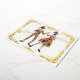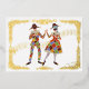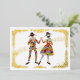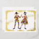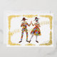 Two debonair harlequin dancers gracefully perform in vibrant costumes against a regal cranberry-red backdrop, adorned with decorative golden garlands and surrounded by delicate musical notes. Original illustration by artist, Noël Snow.