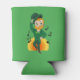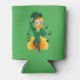 Can Cooler with an Illustration of a smiling happily dancing leprechaun wearing a green suit, a bow-tie, and a bowler hat; with black notes and a yellow and orange rainbow in green background.