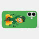 iPhone 16 Case with an Illustration of a smiling happily dancing leprechaun wearing a green suit, a bow-tie, and a bowler hat; with black notes and a yellow and orange rainbow in green background.