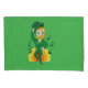 Pillowcase with an Illustration of a smiling happily dancing leprechaun wearing a green suit, a bow-tie, and a bowler hat; with black notes and a yellow and orange rainbow in green background.