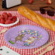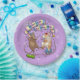 Cute dancing mice on paper plates. Use "Personalise this template" to tweak the "Rachel's 12th Birthday Party" text and create unique, customised party accessories. Plates featuring two happy mice in party hats, dancing as confetti and a ribbon fall around them, with balloons scattered on the floor, with a floral background.