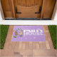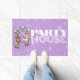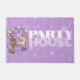 Cute dancing mice on a birthday doormat. Use "Personalise this template" to tweak the "It's Rachel's 12th Birthday! PARTY HOUSE" text and create a unique, customised party accessory. Wall art featuring two happy mice in party hats, dancing as confetti and a ribbon fall around them, with balloons scattered on the floor, with a floral background.