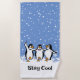 Dancing Penguins Design Beach Towel with customisable background colour and text.