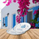 Mediterranean Greek musical bougainvillea-inspired Dancing Queen baby shower paper plates. Indulge in the charm of the Mediterranean with the Mamma Mia-themed baby shower collection! Celebrate your little one's arrival amidst the serene hues of blue and white tiling reminiscent of the Santorini seaside. The invitations are made with playful elegance and pink bougainvillea, while the signs and decor are colourful and beautifully highlight the baby shower celebration. #zazzlemade