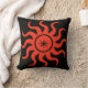 This throw pillow features a wild abstract design of a dancing red sun set on a pure black background. The stylised rays seem to dance around the black centre. The design is repeated on the back.