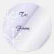 A soft background of mauve and white stripes with elegant white snowflakes dancing about. Customise as desired.