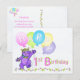 A purple teddy bear princess dressed up in a lovely yellow jewelled crown and pink, blue and green flowers is dancing through the flowers and holding a bunch of colourful balloons with the word HAPPY on them. This happy birthday postcard will bring a smile to a special girl on her 1st birthday. Personalise with her name to make it extra special. Original design by Anura Design Studio.