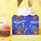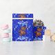 Smiling brown teddy bears holding a glittery number 1 dance around on this fun 1st birthday gift wrapping paper with a festive blue lights background.