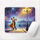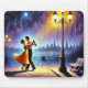 This captures the romantic scene of a couple dancing under the lamppost with the city backdrop.