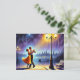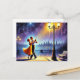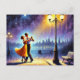 This captures the romantic scene of a couple dancing under the lamppost with the city backdrop.