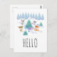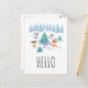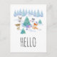A hello postcard with a whimsical forest scene. Happy forest animals dancing around a green fir tree with presents underneath. Happy and joyful watercolor design.
