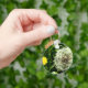 PLdesign photo of big white dandelion seed head and small yellow dandelion flower in background on green grass.