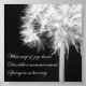 This macro photograph features an elegant dandelion flower. This photo was taken in a field with a black background placed behind the flower. The fluffy white seed pods really pop off of the background. You can see so much detail in this beautiful flower. My poet friend, Michelle Balletto-Wooten, was inspired by this dandelion photo to write a poem in the form of Haiga. Haiga is the poem on its own and Haiku is when the poem is paired with a picture. The poetry is written in white, elegant script. The poem reads "White wisp of joy dance/ Dandelion announcement/ Spring is on her way."