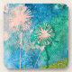 Abstract watercolor art original art of dandelion flower blowing in the breeze on an abstract blue and green cool coloured background.