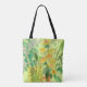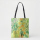 Tote bag featuring delicate floral artwork in yellow and green shades, blooming dandelion flowers in clay pitcher and bird cherry branch in glass vase. Life drawing from artist's sketchbook, mixed media - tissue paper collage and ink pen sketch.