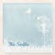 Soft white silhouette of a seeding dandelion and butterflies on a blue background.