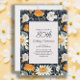 80th birthday party invitation for women designed with pretty little yellow dandelions and white daisies on a navy blue background. Personalise by adding the name of the guest of honour, her age, and her party information. Contact us for help with customisation or to request matching products.