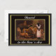 Daniel standing in the lions den on a gold and black postcard. Has Daniel in the lions den with seven lions wanting to eat him .As he plays to god .He has a red and white rob on.