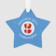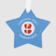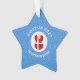 Hanukkah decor star shaped ornament for the holiday season shows an angel wearing the red and white flag of Denmark. Designed for families of multiple religions, the Hanukkah Danish angel is found in the centre of white squiggly squares, surrounded by blue squiggly squares. Add a name to personalise. Customise by adding the year. Or, add your own text.