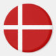 The red and white flag of Denmark, or Dannebrog, has a Nordic or Scandinavian Cross. The red is the background, the cross is in white. The Danish flag shows here on a round magnet.