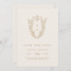 The simple yet classic design features an elegant and timeless ornate crest monogram with florals and greenery surrounding the initials of the couple.