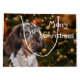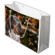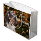 Cute long haired dappled or spotted dachshund in front of a Christmas tree with somewhat matching colours dog lovers Christmas holiday large gift bag