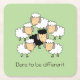 Funny black sheep napkins. A group of white sheep with pink faces and grey ears are surrounding a woolly black sheep, also with a pink face and grey ears. Below is a caption "dare to be different" in black lettering.