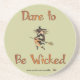 A lovely little witch in striped stockings tips her hat while riding on her broom, and dares you to be wicked!