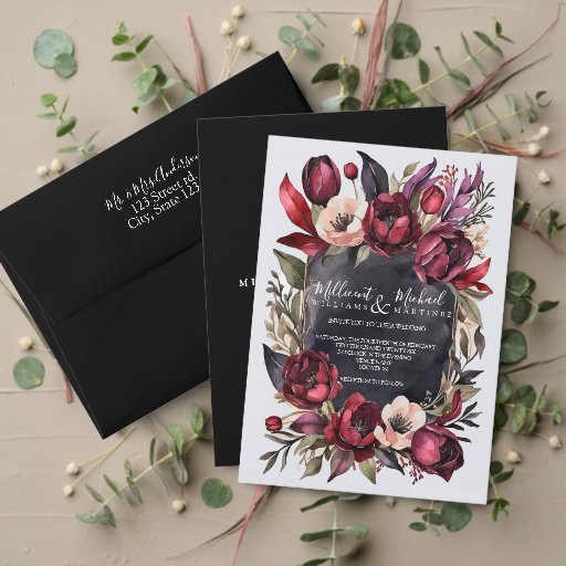 This wedding invitation design features an alluring dark aesthetic feel. It’s designed with beautiful deep red, purple/plum, and cream flowers. The background contains a black watercolor wash with green foliage. Designed in a deep, sophisticated colour scheme. Personalise the template with the bride and groom's names in elegant script typography. The back of the invitation is black and features the option to customise with the couple's names and wedding date.