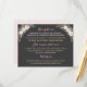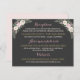 Our vintage boho floral wedding information details card features a moody floral arrangement of romantic roses, peony and anemone flowers, greenery, and rustic bohemian feather accents in rich shades of dusty rose, mauve pink, cassis, creamy white, moss green, grey, and gold on a dark grey / black background colour. A dramatic and dreamy colour scheme for your fall or winter wedding. Personalise the beautiful custom wedding reception, accommodations, and wedding website text for your elegant rustic wedding day.