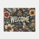 This is a doormat with a black background that has flowers and birds.