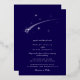 This elegant wedding invitation features a deep dark blue background with white celestial artwork. The design includes shooting stars, delicate constellations, and fine silver foil accents. The layout is clean and balanced, creating a timeless and romantic look.