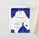 This elegant and glamourous sweet sixteen birthday invitation features a beautiful princess with brown hair in a dark blue ball gown. The text combines handwritten script and modern sans serif fonts for a classy and sophisticated look. The floral arrangements, butterfly and silver confetti create the perfect blend of rustic and chic.
