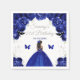This elegant and glamourous birthday party napkin features a beautiful princess with dark skin in a dark blue ball gown. The text combines handwritten script and modern sans serif fonts for a classy and sophisticated look. The floral arrangements, butterfly and silver confetti create the perfect blend of rustic and chic.