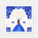 This elegant and glamourous sweet sixteen napkin features a beautiful princess with dark skin in a dark blue ball gown. The text combines handwritten script and modern sans serif fonts for a classy and sophisticated look. The floral arrangements, butterfly and gold confetti create the perfect blend of rustic and chic.