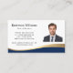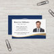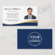 Modern, dark blue and golden (printed colour gradient, not real foil) curved border business cards with your custom photo, name, title and contact information. You can change background and font colours, move and resize elements with the design tool. Upload your logo on the back.