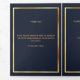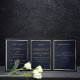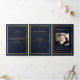 An elegant tri-fold program. A dark blue background, a faux gold frame and space for your photo. Personalise and add name, dates and your text.