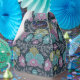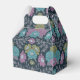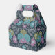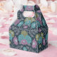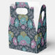 This favour box features flowers in shades of purple, blue, and olive green surrounded by muted purple fern fronds and leaves on a dark blue background.