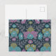 This postcard has flowers in shades of purple, blue, and olive green surrounded by muted purple fern fronds and leaves on a dark blue background.
