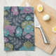 This kitchen towel features flowers in shades of purple, blue, and olive green surrounded by muted purple fern fronds and leaves on a dark blue background.