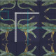 Modern chinoiserie-inspired fabric with a pattern of stylised watercolor crane birds in slate blue-grey tones on a dark purplish blue background.