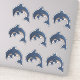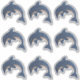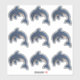 This vinyl sticker sheet has a total of nine separate dolphins who are dark blue and white with a faux white glitter look. They are in a jumping position with a black and white swirl eye.