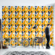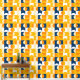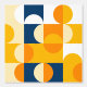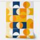 This design showcases a modern geometric pattern with circles and half-circles in shades of dark blue, yellow, ivory, and orange against a white backdrop. It's an elegant and stylish design that embodies eclectic minimalism, perfect for artistic interior designers, decor enthusiasts, trendsetters, and fans of vintage retro or abstract digital geometric motifs. This ornate yet funky hipster pattern is versatile, available on a variety of contemporary home decor items, making it suitable for enhancing the ambiance of spaces such as master or children's bedrooms, kitchens, nurseries, living rooms, women's caves, college dorms, condos, studios, or apartments.