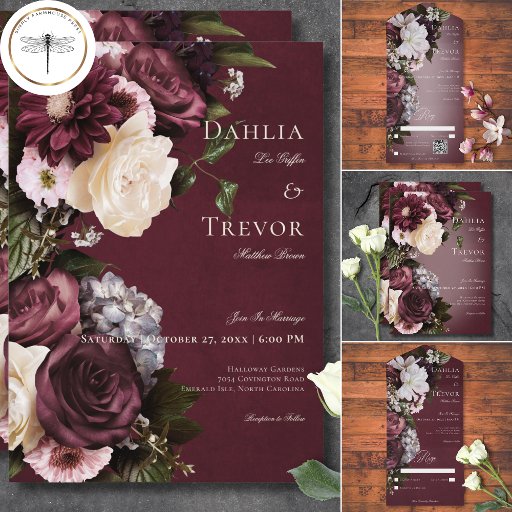 Step into a realm of exquisite elegance with our floral dark and moody wedding response card with dinner options. Designed to captivate the senses, this invitation boasts a striking burgundy background adorned with a breathtaking burst of rich burgundy and cream roses, pale lavender grey hydrangeas, and other mixed florals in soft white and palest pink, complemented by lush olive green foliage. The creamy text delicately floats upon a soft blur of light, adding a touch of romance to the overall allure. Embrace the opulence of the season and set the tone for your special day with this stunning design, sure to leave a lasting impression on your guests. Created by Simply Farmhouse Press.