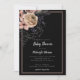 Beautifully dark baby shower invitation with beige and pink floral, ferns, raven feathers, twigs and berries on a black background.Gothic style typography adds to the dark feel. See coordinating items in our shop, Enchanted Finch.