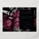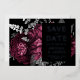 This elegant, moody wedding Save the Date card features a lush, romantic floral bouquet in burgundy red with silver faux foil and glitter foliage on a black background. Customise the real silver foil text in stylish fonts on a black rectangle, and add your wedding website URL to the solid black back.